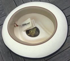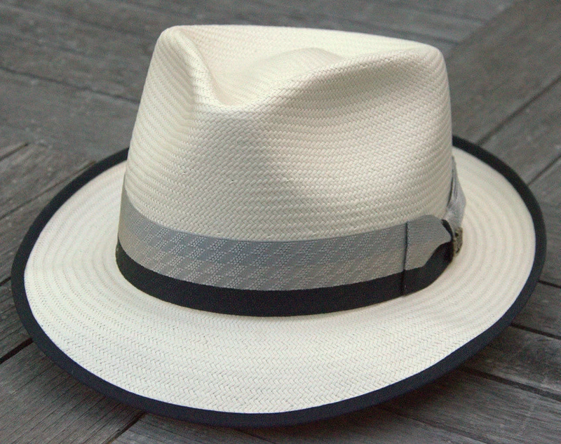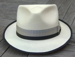 Easton Shantung Fedora in ivory with black and grey decorative hat band has a 4 3/8ths inch crown and 2 inch brim. Inner sweat band is cloth for maximum comfort.