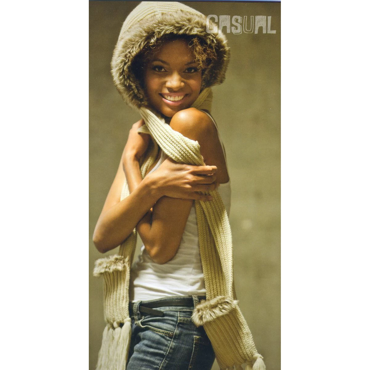 An all in one piece of clothing, this scarf with hoodie keeps you, your head and your hands warm and looking good on a cold day.
