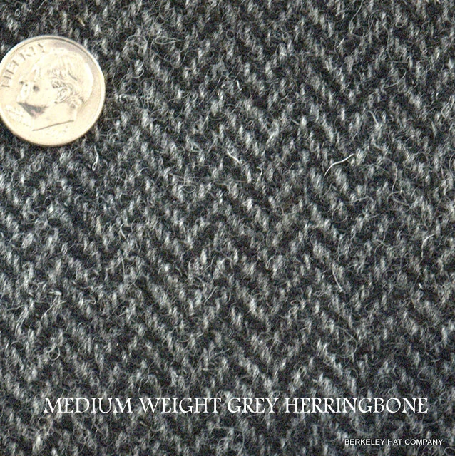 Irish ivy herringbone driving cap in a heavier weight larger pattern 100% wool tweed in heavy weight charcoal grey against black with light grey flecks.