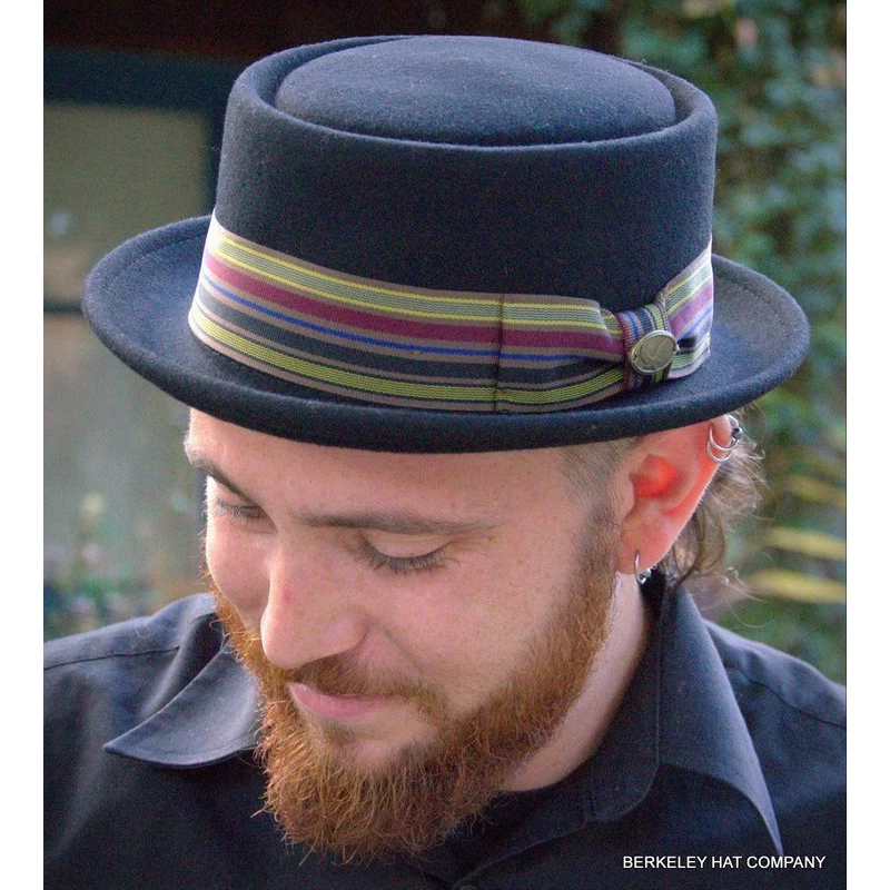 Soft wool felt pork pie with striped band.