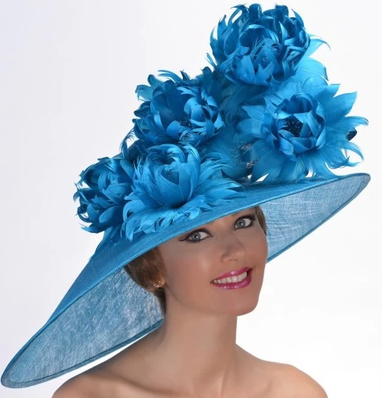 The “flowers” are actually made from individual feathers, just behind this large bouquet is a large half bow in sinamay straw.