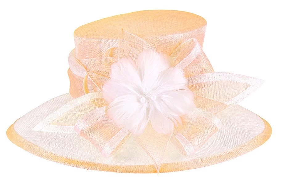 Decorated at the right to the front with sinamay bow and feather flower with pearls at the center.