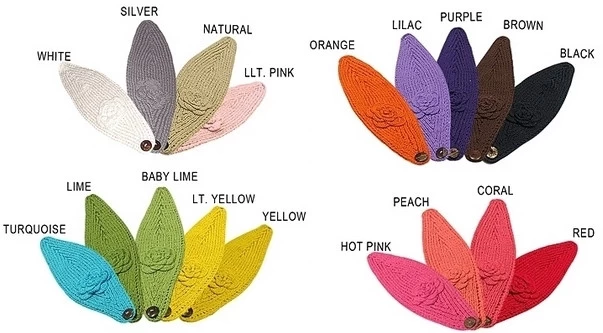 Women’s knit head band in cotton is approximately a 4 inch wide knit head band that tapers toward the ends into a button closure.