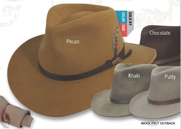 Outback hat in wool felt, a continually popular Aussie style. Roll it up and take it anywhere- this outback is a totally packable hat. Pack it in your suitcase and it’ll come right back to shape. From Scala of California.